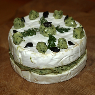 Ein ganz besonderer Tipp: Camembert in der Hälfte durchschneiden und mit der Kräuterbutter füllen und verzieren: